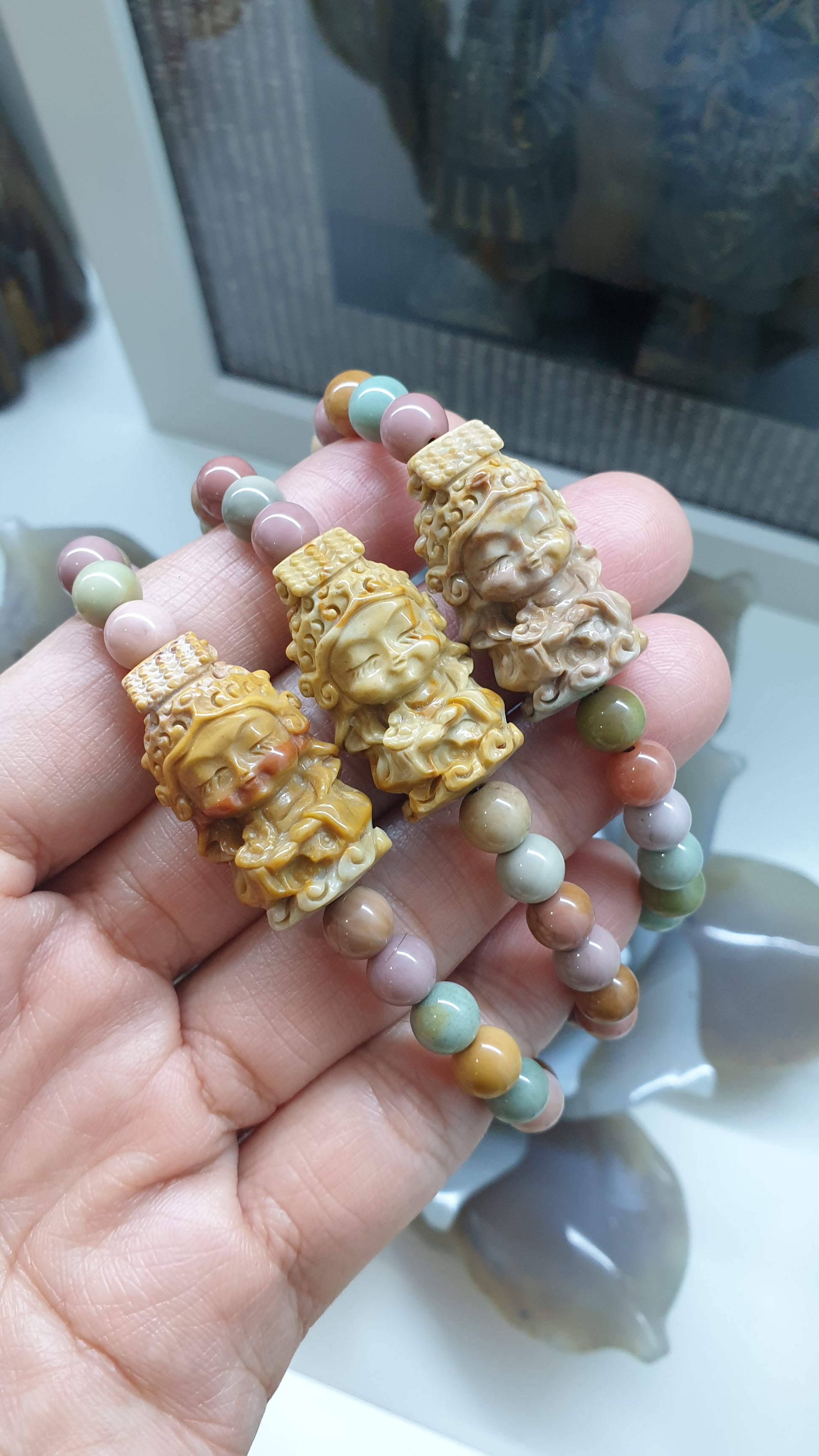 This charming bracelet features natural Alashan Jasper beads in warm, earthy tones and a detailed 3 cm Ru Yi Empress carving—symbol of status, power & good fortune.