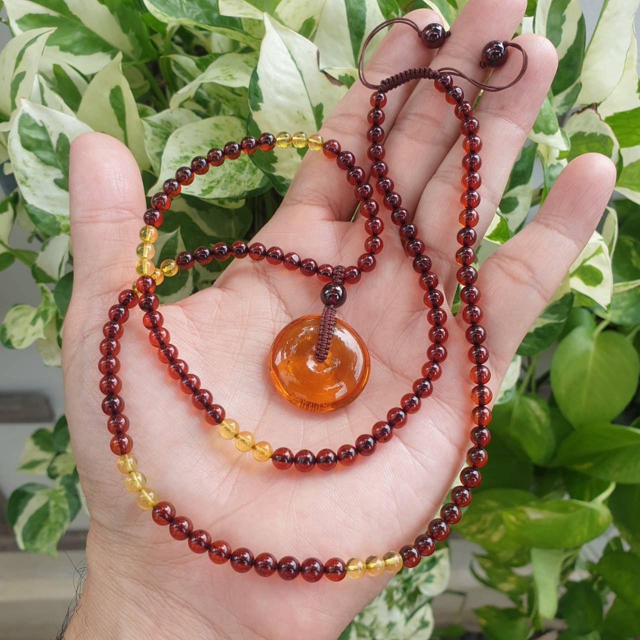 A specially crafted Amber Ping An Kou (Peace Buckle) beaded necklace with natural honey and yellow Amber beads (5 mm size, Myanmar origin). Radiant, golden honey Amber Disc pendant, 25 mm x 9.5 mm x 25 mm in dimension. Handcrafted adjustable necklace woven on double strand of brown thread; 25 inch round plus 1.75 inch pendant (Ping An Kou, head bead & woven thread bail). 7 mm size Hessonite Garnet beads were used as head bead for the Ping An Kou and hanging beads for back adjusters. Whole necklace weighs 15 grams total.