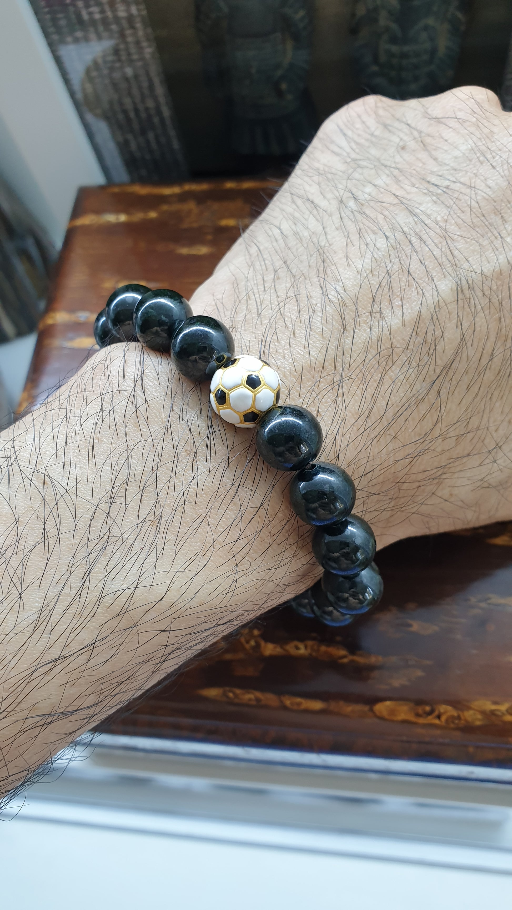 Showcasing this thoughtful Gent's bracelet with 11 mm glossy black, green-tinted Jade beads, accented with 24K Gold Football charm (12 mm size, 1.472 grams) in black & white enamel, this piece is the embodiment of a gentleman's masculine elegance and sociable nature.