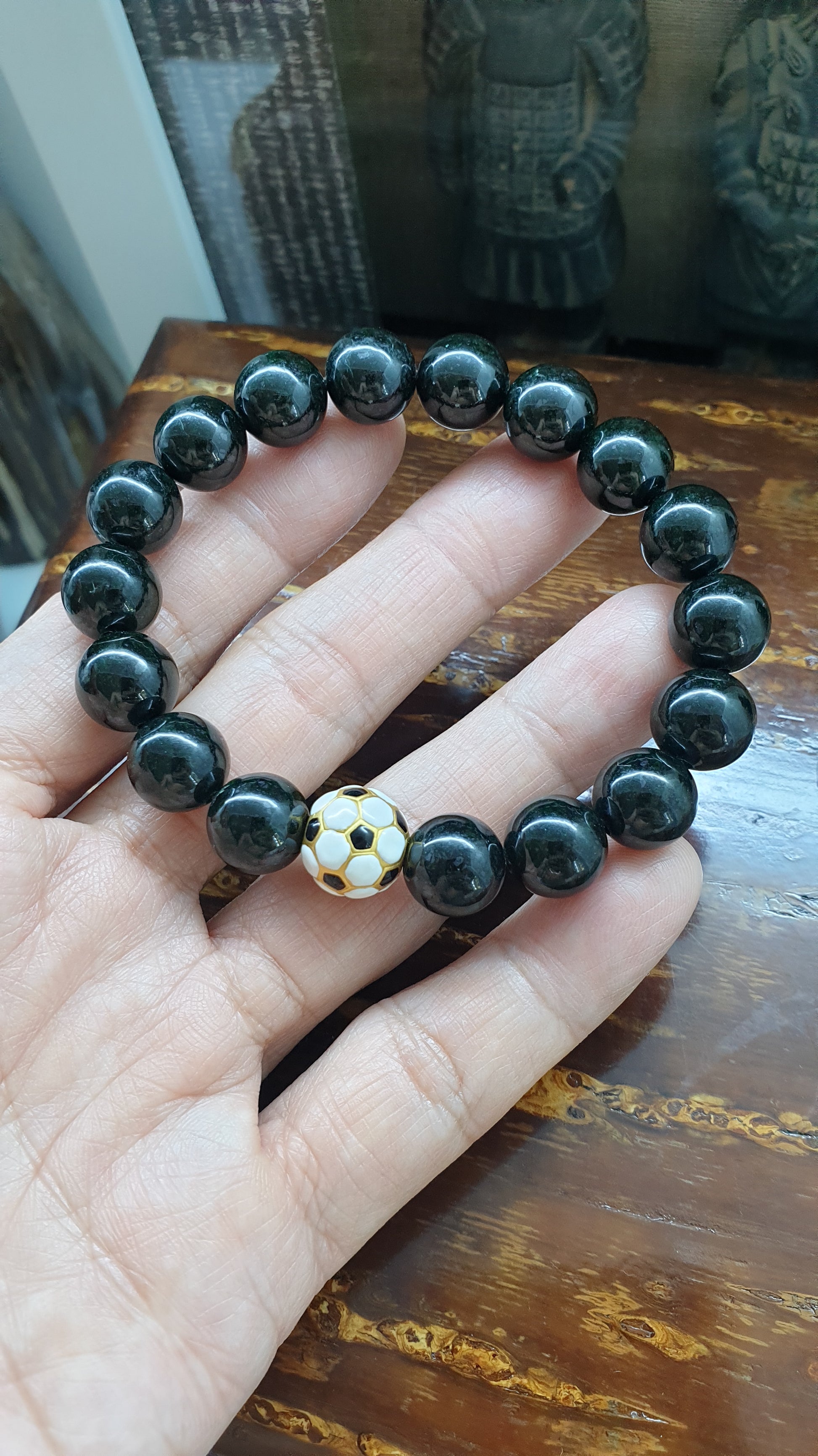 Remarkable green tone may be seen on the Black Jade beads under direct lighting. Fei Cui, Type A natural Chloromelanite Jade (Myanmar origin, untreated). Football (Soccer) charm is pure gold (Au999), 99.99% gold.