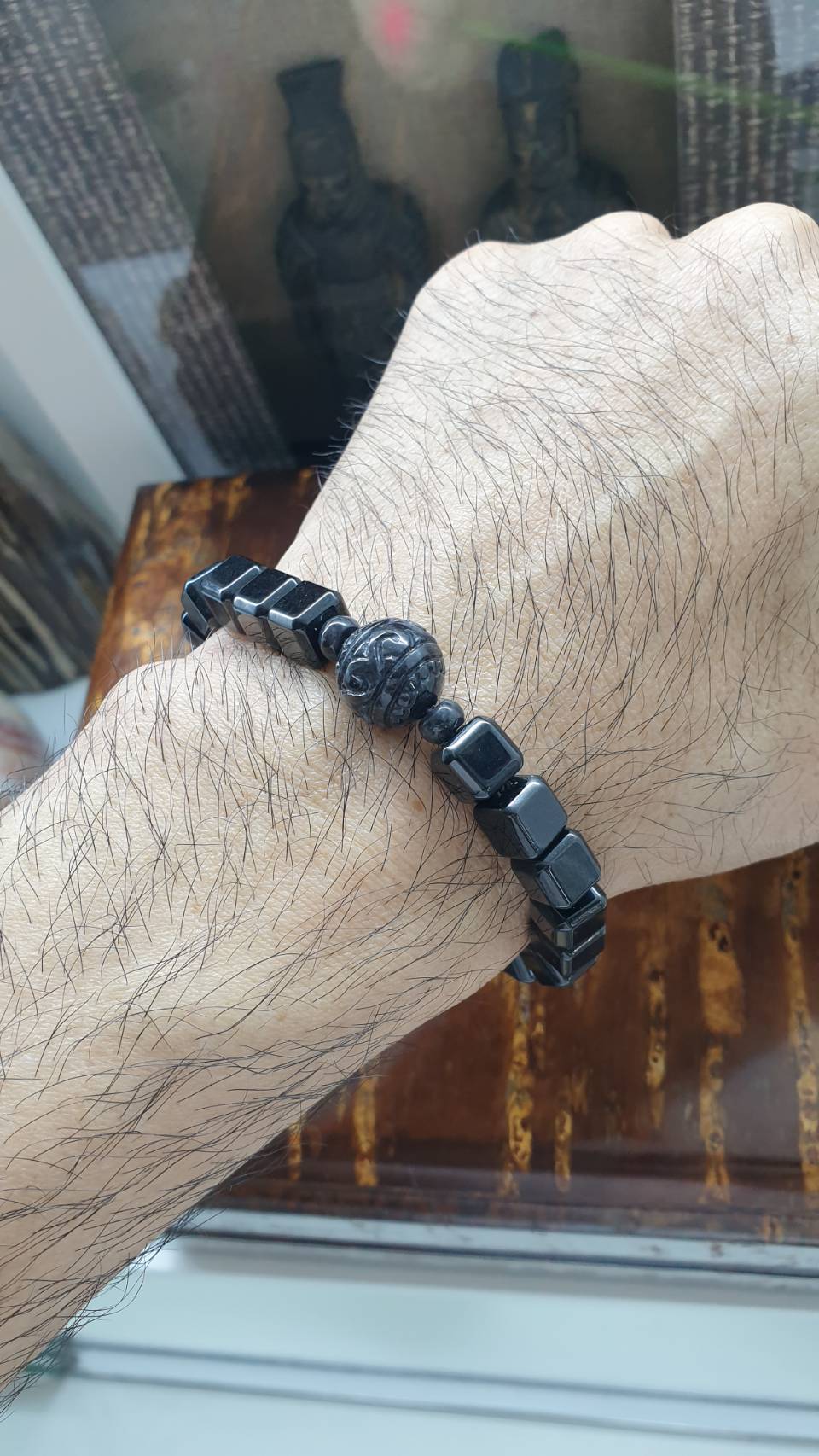 Black Jade cube beaded bracelet charmed with a 4-Dragons amulet (23 mm x 23 mm) opposite a wish-fulfilling Ru Yi bead (13 mm), to create this uniquely stylish luckycharm bracelet 🤗. Double-sided amulet have a 4 mm through at its core and have each of the 4 Dragons facing a different direction. The facets of the cube beads (9 mm) add shine and shimmer, making it an eye-catching, his or hers wrist accessory 😃. All Black Jade components, Type A natural Chloromelanite Jade (Myanmar origin, untreated). Size 17 cm bracelet, resizeable on demand via direct measage immediately after purchase. Any beads taken out will be included with extra sets of elastic strings and an open wire (string guide).