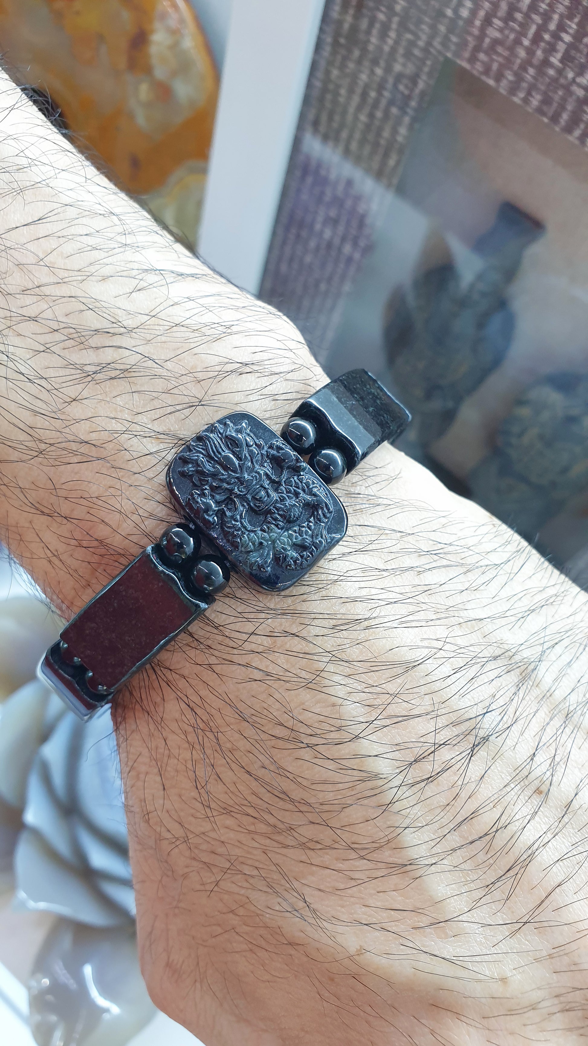 Gent's Power Bracelet and wrist accessory for wealth and prosperity - full Black Jade rectagular beads and a Fierce Dragon bead charm; all Fei Cui, Type A, natural Chloromelanite Jade (untreated). Jade Dragon charm measures 17 mm x 8 mm x 24 mm. Size 19 cm, resizeable on demand via immediate Direct Message after the purchase. Any bead/s taken out will be shipped with extra sets of elastic strings and an open wire (string guide). Listed price is for 1 bracelet only.