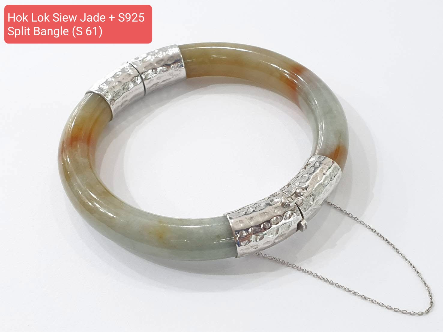 A naturally tricolored, vintage Jade cylindrical bangle, split and fitted with an elegant hammered style Sterling Silver triple safety lock (hinge, push lock, figure 8 clasp and 7.5 cm safety chain) (our original design). Selected piece of glossy, well-polished Type A natural Jadeite (Myanmar origin, untreated), orange-yellow in color with green and brown marblings. The actual Jade bangle is an old piece made in the 1990's. Bangle size 61 (6.1 cm inner diameter, 19.2 cm circumference), 1 cm width, 1 cm thickness and weighs approximately 67 grams total.
