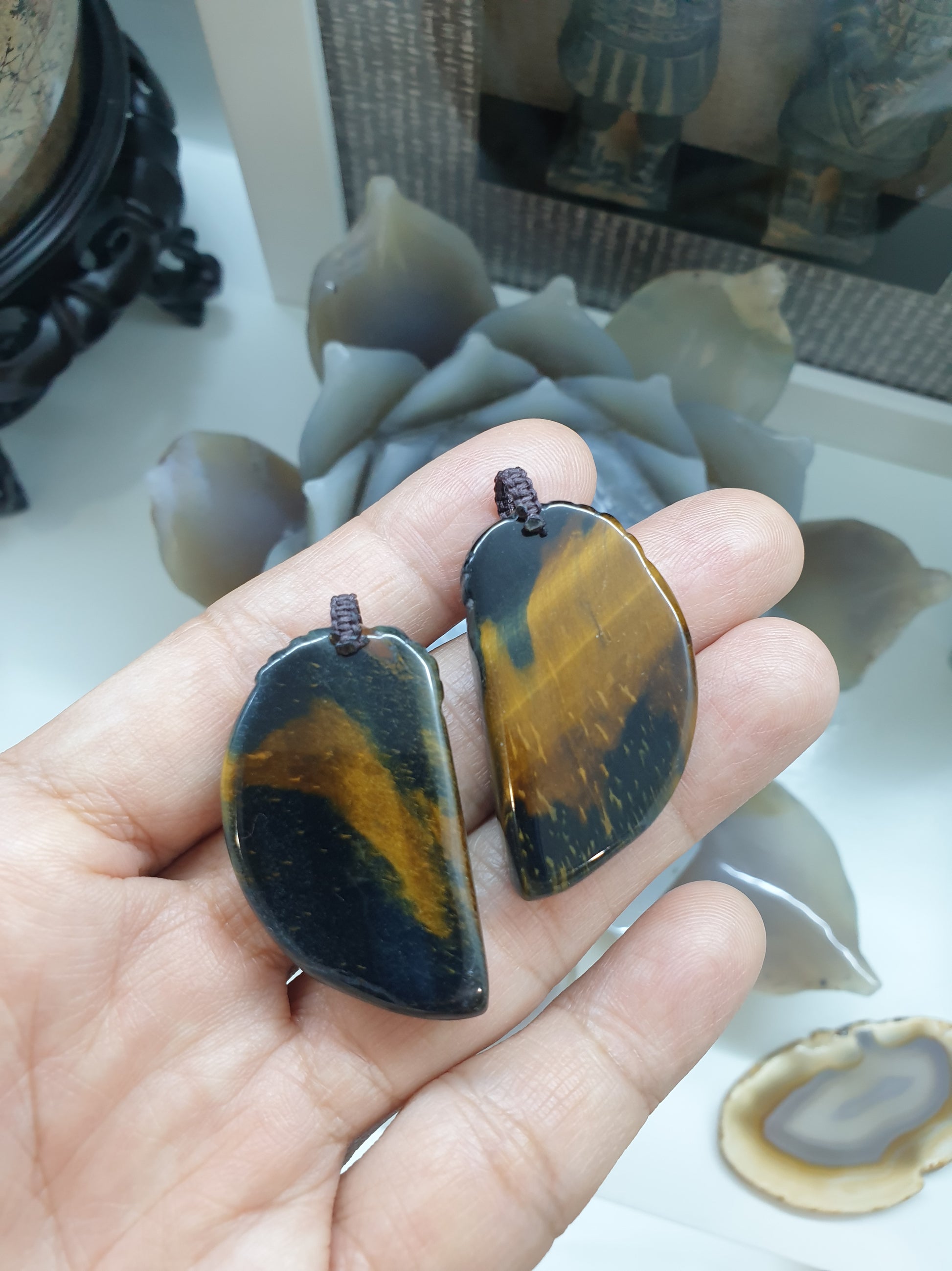 In Chinese Culture, the Dragon and Phoenix are often paired together, representing the harmonious union or the marriage of masculine and feminine energies (Yin and Yang). The dragon embodying strength and power is seen as the Yang or masculine counterpart, while the Phoenix, representing grace and beauty, is the Yin or female counterpart. Giftable luckycharms and pendants 🎁; selected pairs of chatoyant, golden brown Tiger's Eye Dragon and Phoenix in custom braided, maroon colored bails. A piece is 2.3 cm wide, 4.5 cm tall and weighs around 11 grams. May be worn on gold or silver or rope chains or necklaces. Listed price is for 1 pair of pendants only.