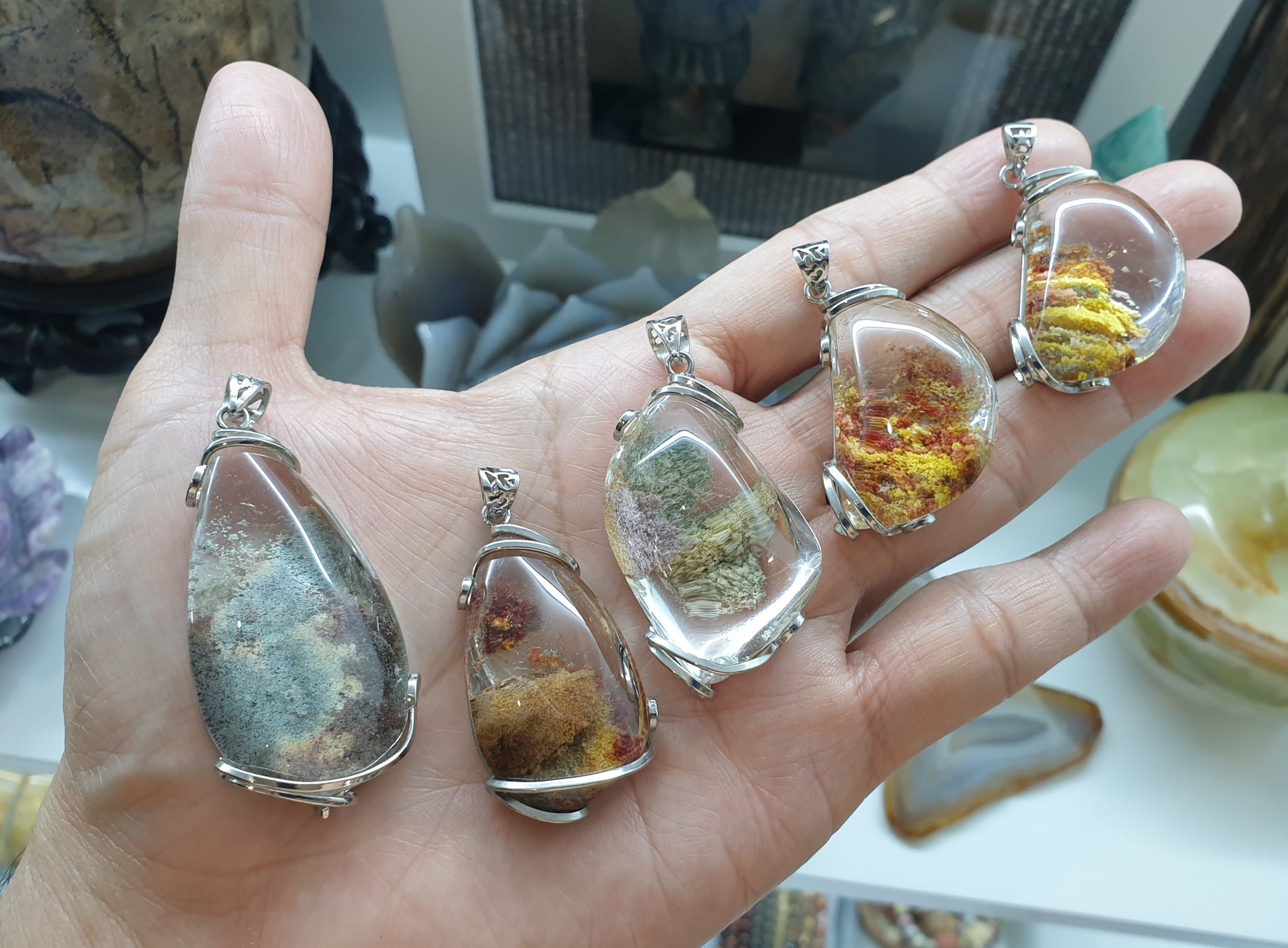 Giftable luckycharms and pendants 🎁. Amazing colorful phantoms in these selected chunks of celestial Garden Quartz. Bail and setting in Sterling Silver (hallmarked S925). Whole pendant weighs 17 grams - 25 grams a piece and as much as 5 cm - 6 cm in height. Bail hole measures 4 mm. These pendants may be worn with gold or silver or rope chains. Listed price is for 1 piece pendant only.