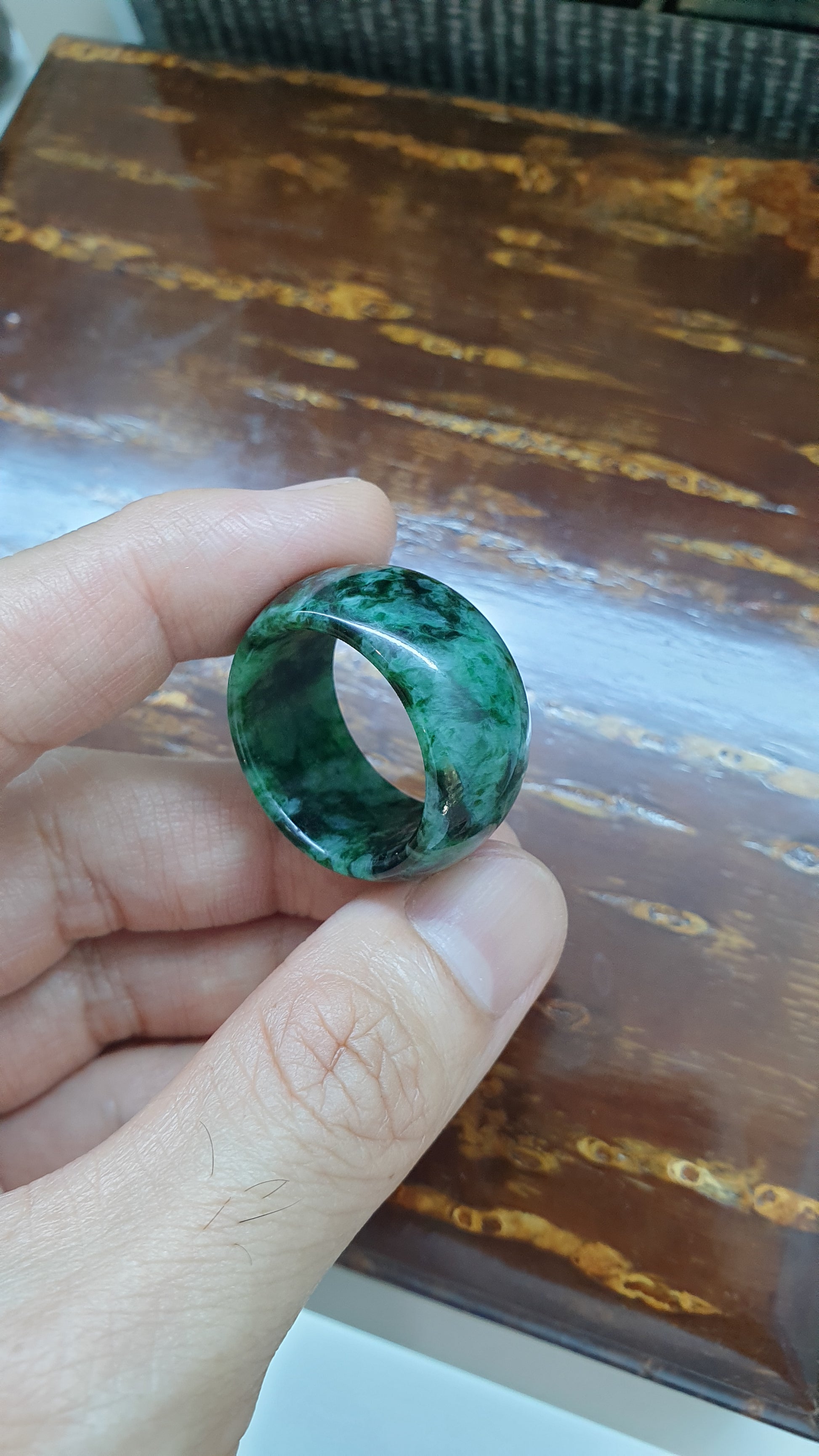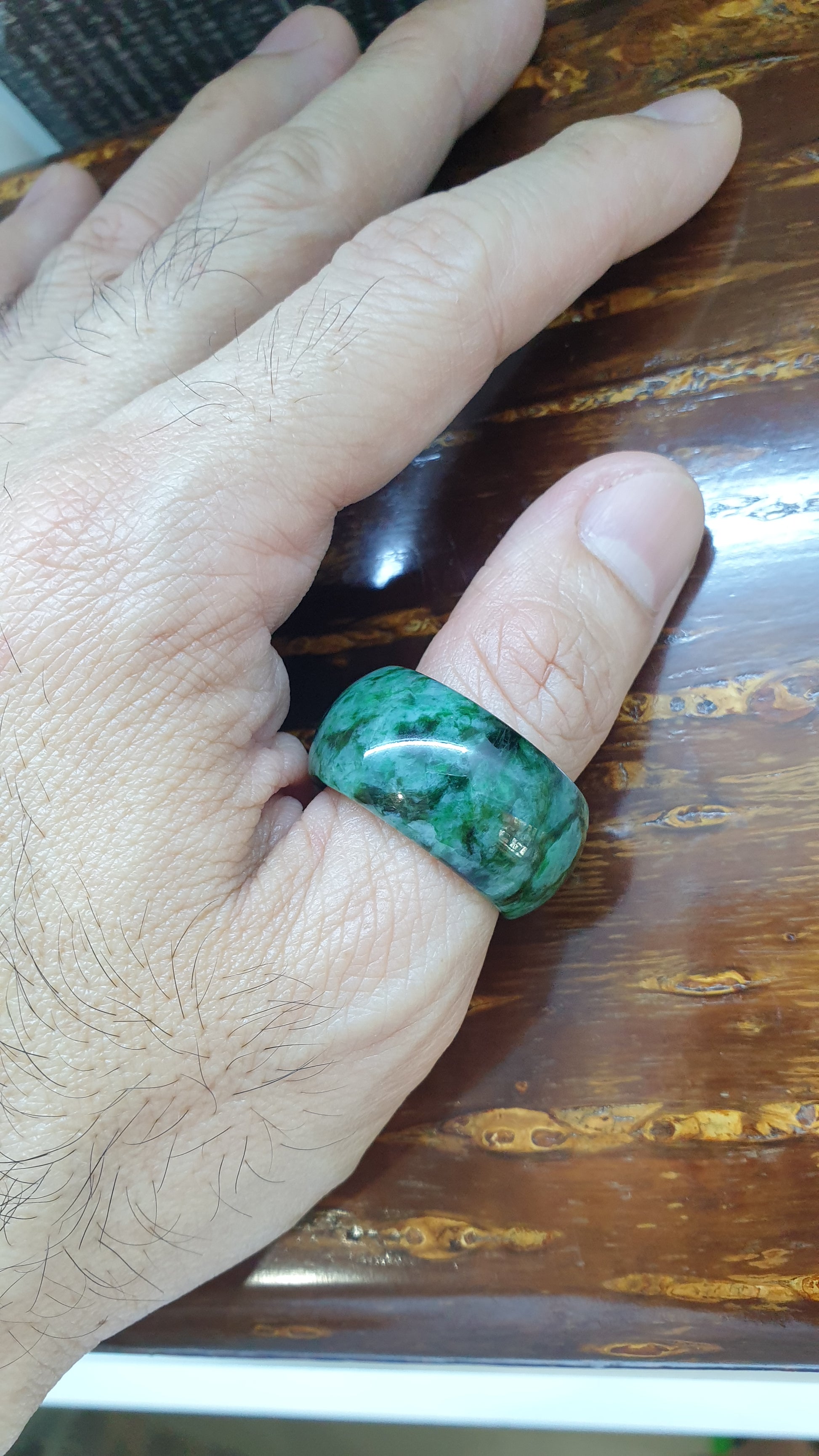 An elegantly made Archer's ring crafted from Fei Cui Type A Jadeite, guaranteed natural (untreated) and authentic - Myanmar origin. Well-polished, translucent green with amazing black marblings. Ring size 70 (13 US), 1.4 cm in width, 0.5 cm in thickness and weighs approximately 12 grams. Rare, collector's piece material.
