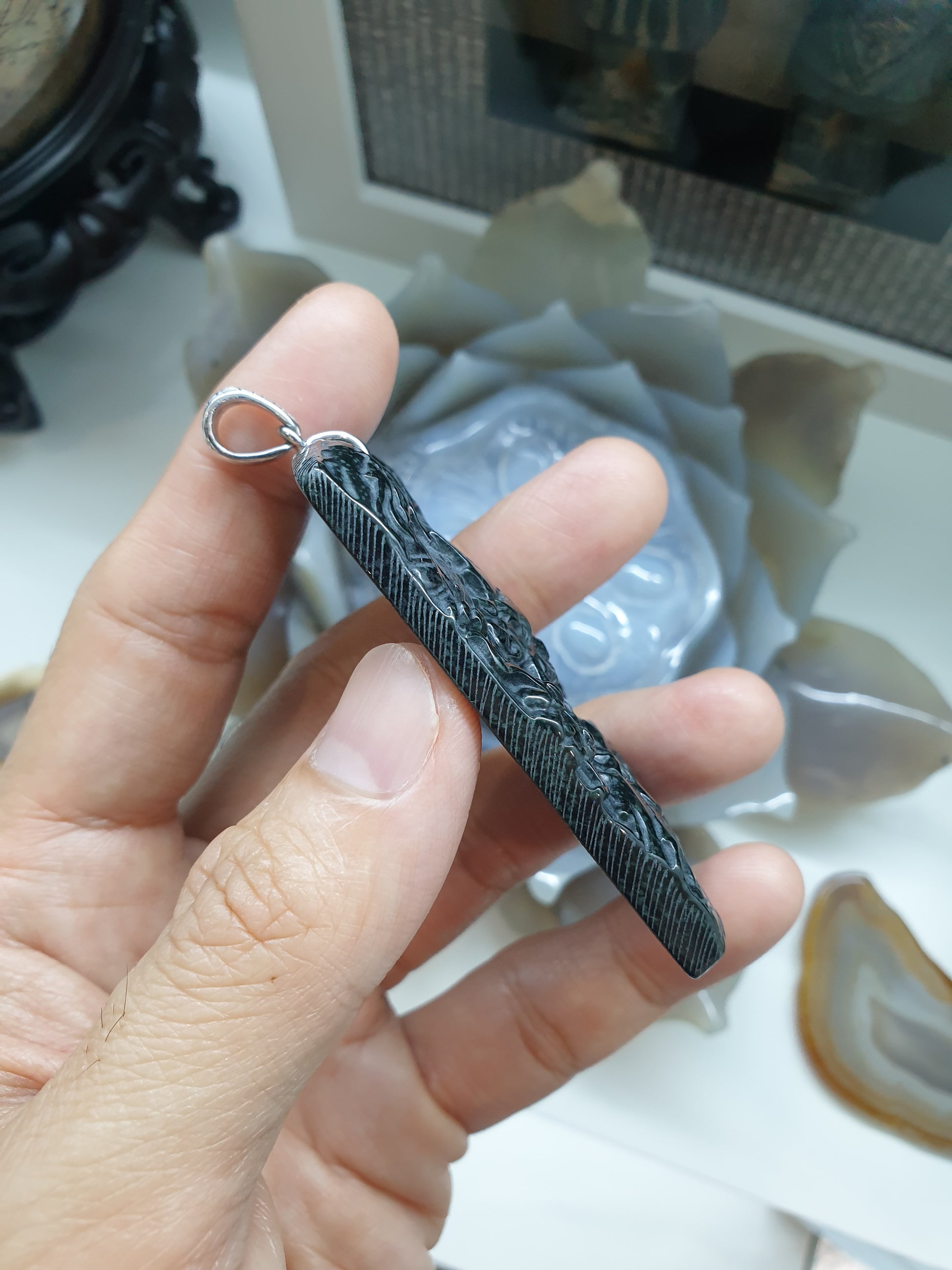 Black Jade Dragons in textured Sterling Silver bail. Pendant shows the mythical 5 Dragons - five heavenly beasts embodying the 5 elements and the 5 Dragon Kings who represents immense power, wisdom and capabilities. This beautiful pendant measures 4 cm wide x 0.7 cm thick x 8 cm tall (bail included) and weighs 39 grams. Type A natural Chloromelanite Jade (non-bleached, non-dyed, non-treated material) of black color with green translucency.