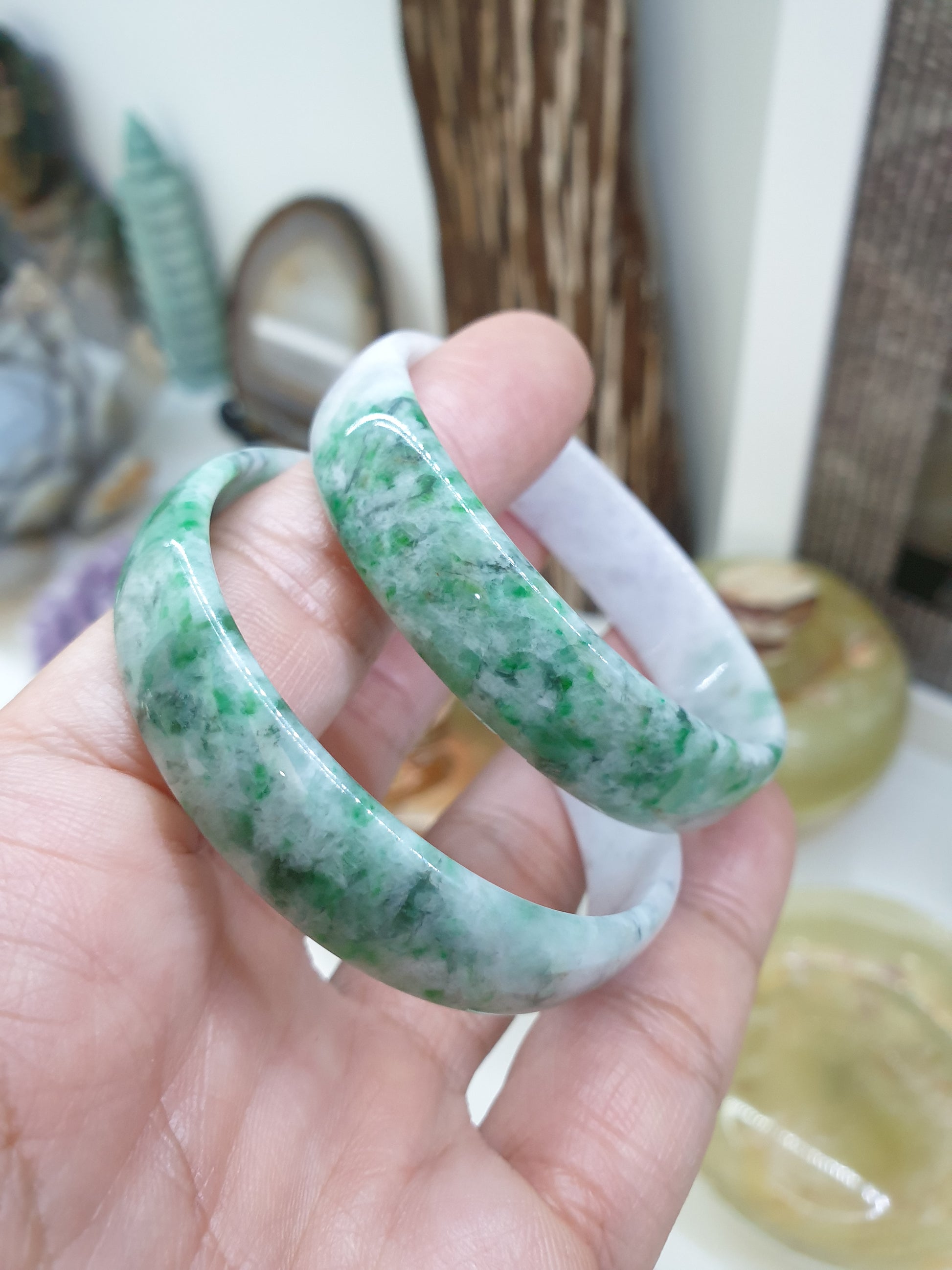 Svelte, elegant-looking Jade Bangles in rare Size 52.8 (5.28 cm inner diameter, 16.6 cm circumference), 1.2 cm width, 0.45 cm thickness. Superb translucency, glossy, high polished, Fei Cui Type A natural Jadeite (Myanmar origin, untreated).