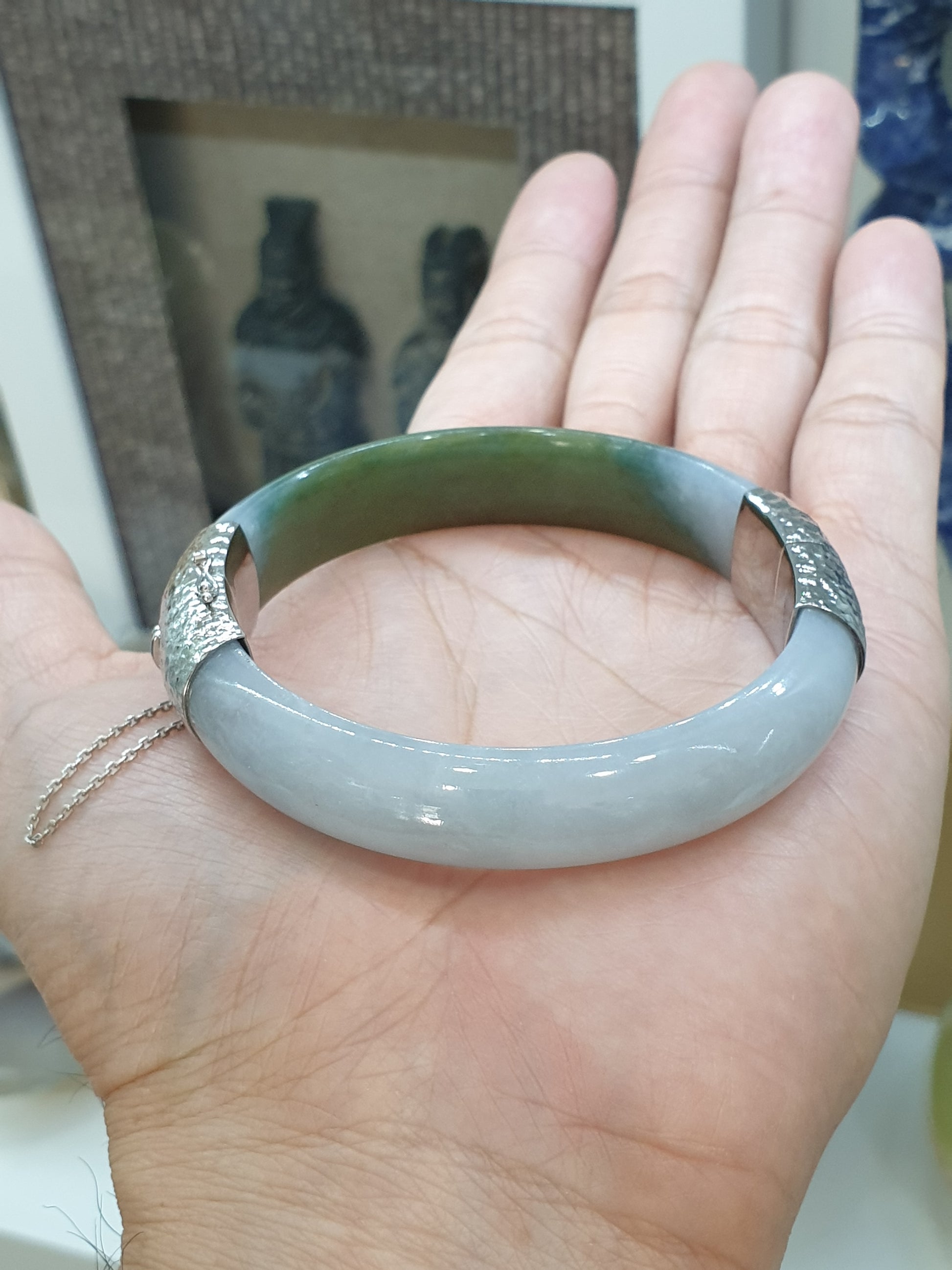 A naturally 2-toned Jade bangle (lavender and green), split and fitted with an elegant hammered-style Sterling Silver triple safety lock (hinge, push lock, figure 8 clasp and 7 cm safety chain) (our original design). Selected piece of semitranslucent, Type A natural Jadeite (Myanmar origin, untreated), rare 2-toned (lavender and green), glossy, well polished and with natural lines. The actual Jade bangle is a vintage piece made in the 1990's. Bangle size 60 (6 cm inner diameter, 18.85 cm circumference), 1.3 cm in width, 0.70 cm in thickness and weighs approximately 57 grams total.