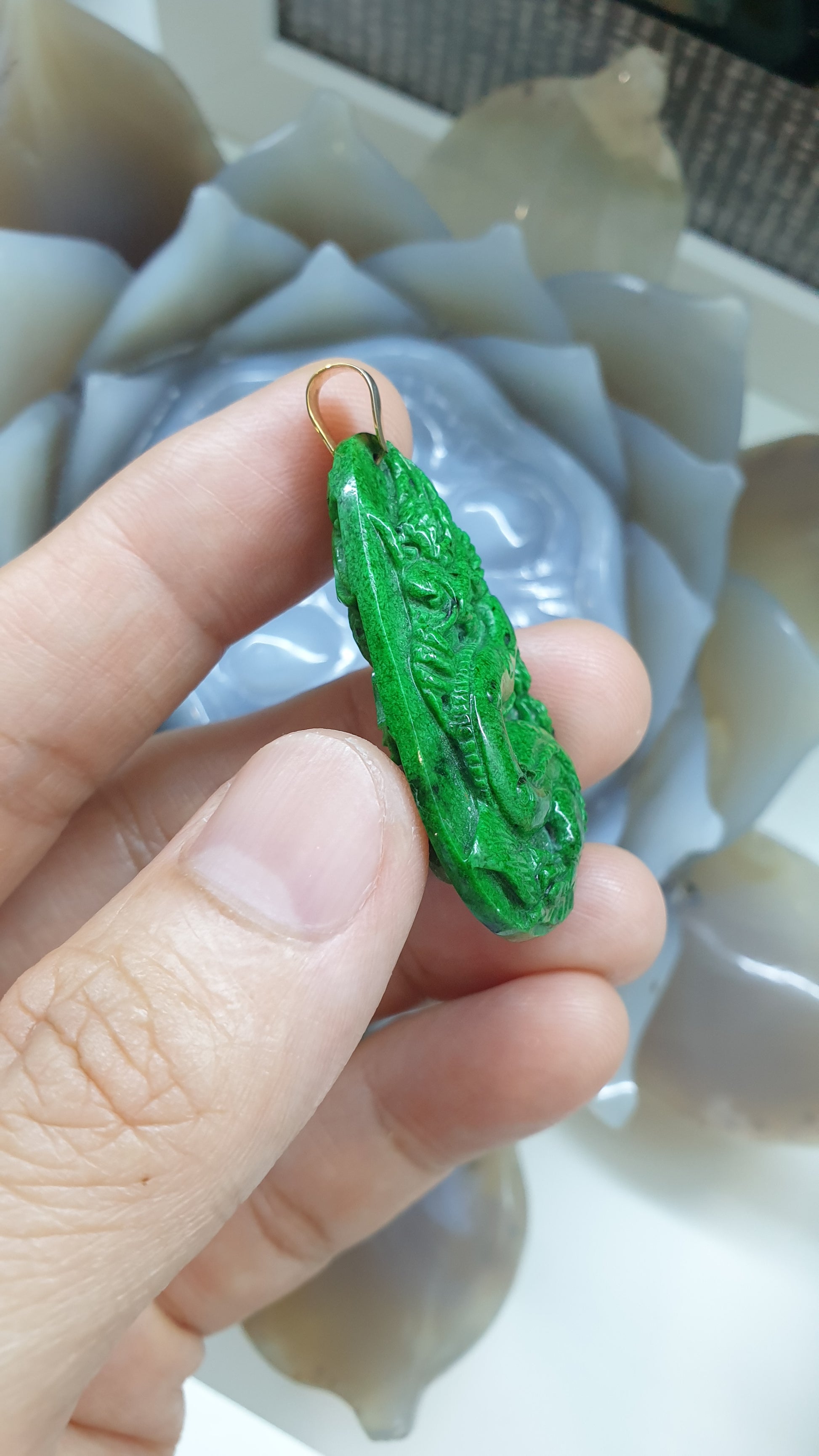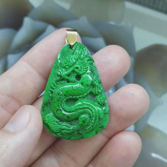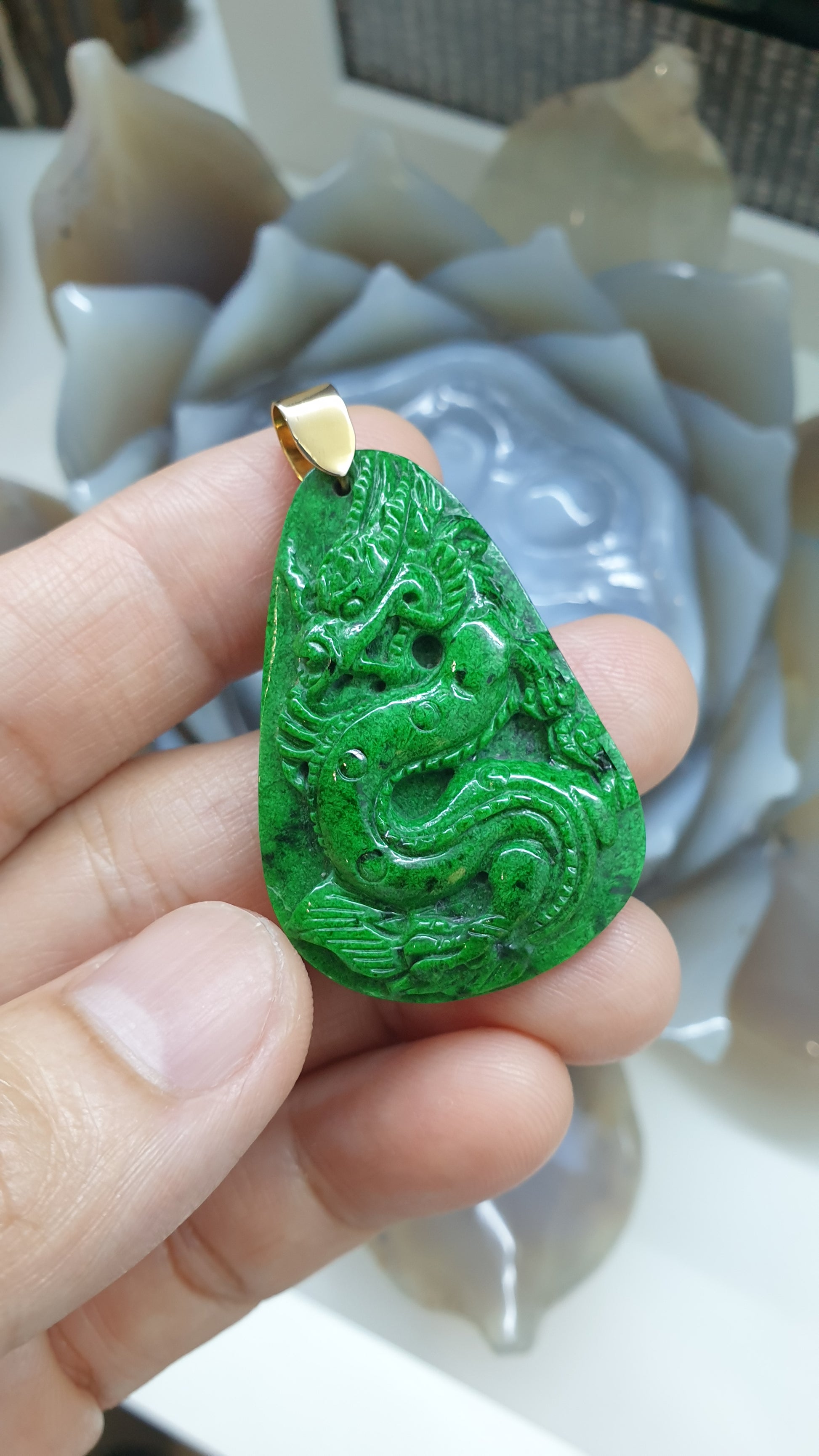 Dragon and Phoenix, auspicious mythical creatures, carved in back to back detail on Mawsitsit stone and hangs on solid 18K Gold bail (Au750). Mawsitsit is a rare, black-speckled, chrome green gem reated to Jadeite; Type A material from Myanmar (untreated).