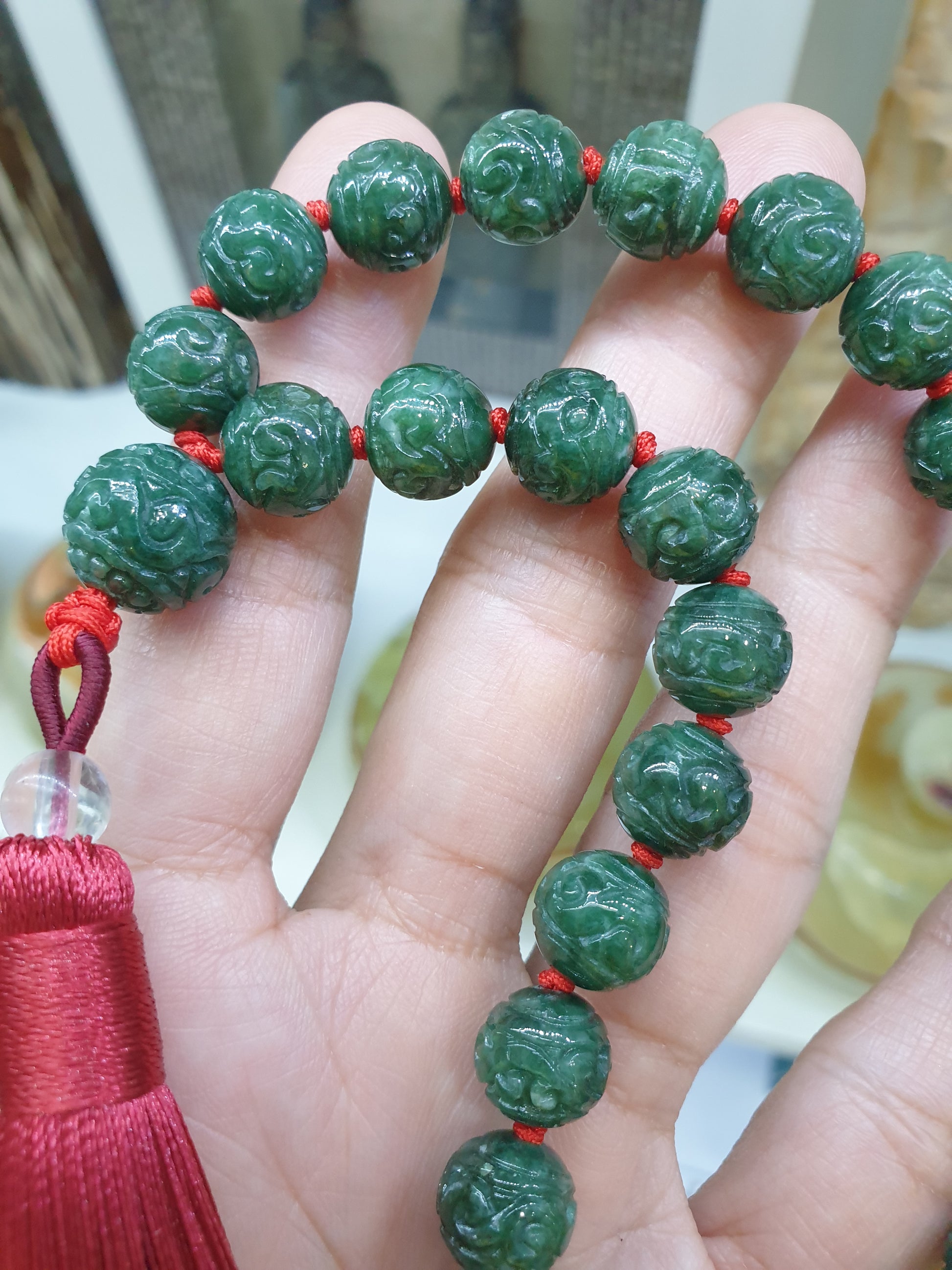 Ideal for gifting🎁 as lucky charms for bags, vehicles, doors, offices and homes. Handcrafted by Pim's Stones Thailand, Jade Beads Japa Mala (27 beads version, 17 inch total length). 10 mm size, consistent deep Green, engraved Ru Yi Jade beads for wish-fulfilment and good fortune, strung in 2 strands of red thread with each bead separated by a knot. Ru Yi Guru bead, also of deep green tone, is 13.5 mm size. All Jade components are Type A natural Jadeite (untreated). Tassle is composed of maroon threads and is 5.5 inches long. Whole Mala necklace is 11 inches round plus a 6 inch pendant (Guru bead & tassle) and weighs approximately 60 grams. Choose well made, choose prayer beads by Pim's Stones Thailand.