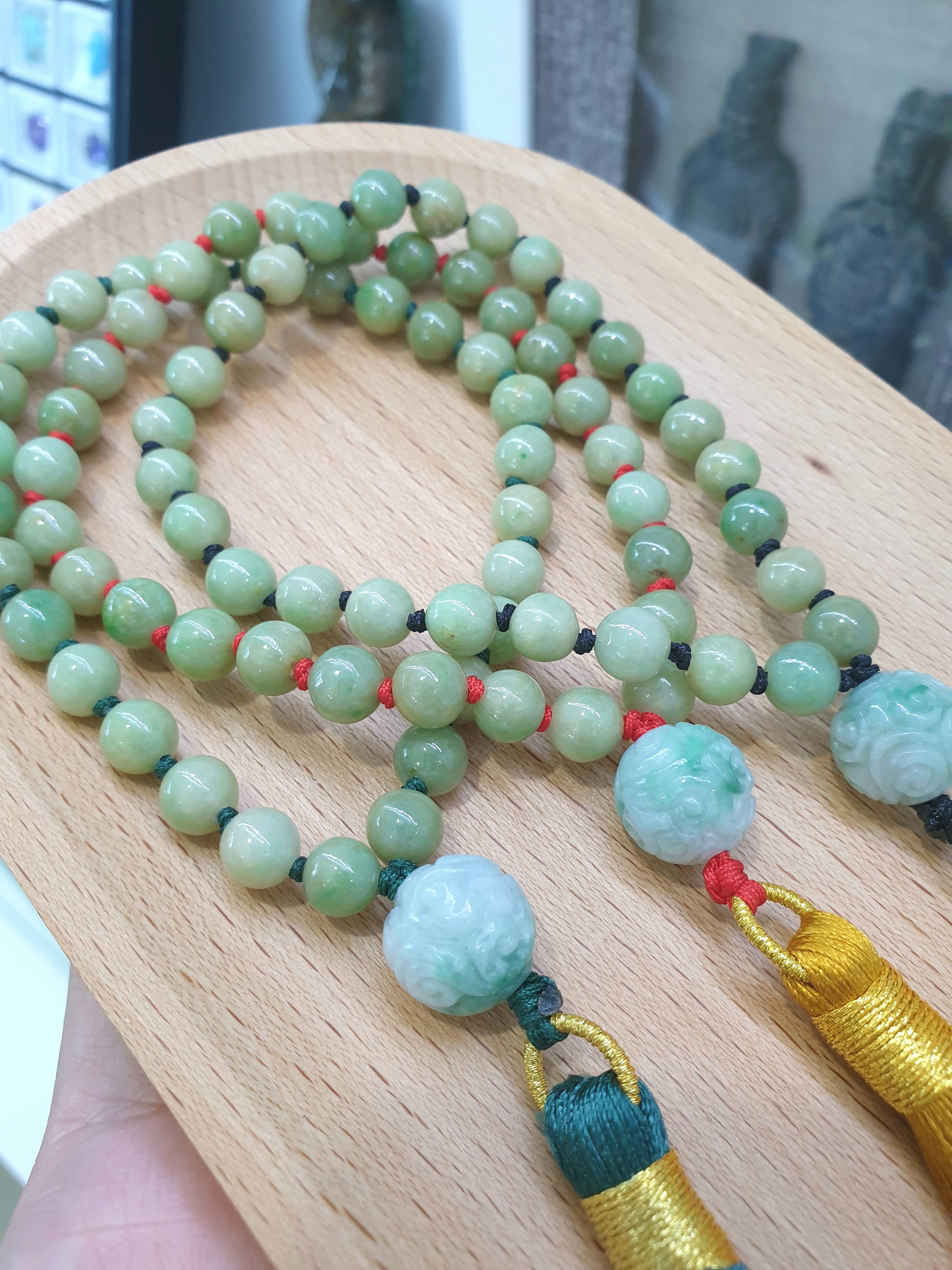 Ideal for gifting🎁 as lucky charms for bags, vehicles, doors, offices and homes. Handcrafted by Pim's Stones Thailand, vintage Jade Beads Japa Mala (27 beads version, 12 inch total length). handmade Jade beads, old polished, 7.5 mm size, of yellow green color, strung in 2 strands red or brown or green thread with each bead separated by a knot. Moss in Snow Jade Guru bead is 13.5 mm size, engraved with Ru Yi swirls for wish-fulfillment and inviting good fortune. All Jade components are Type A natural Jadeite (untreated). Golden or Brown or Green Tassle is 3 inches long. Whole Japa Mala is 8 inches round plus a 4 inch pendant (Guru bead & tassle) and weighs approximately 24 grams. Choose well made, choose prayer beads by Pim's Stones Thailand.