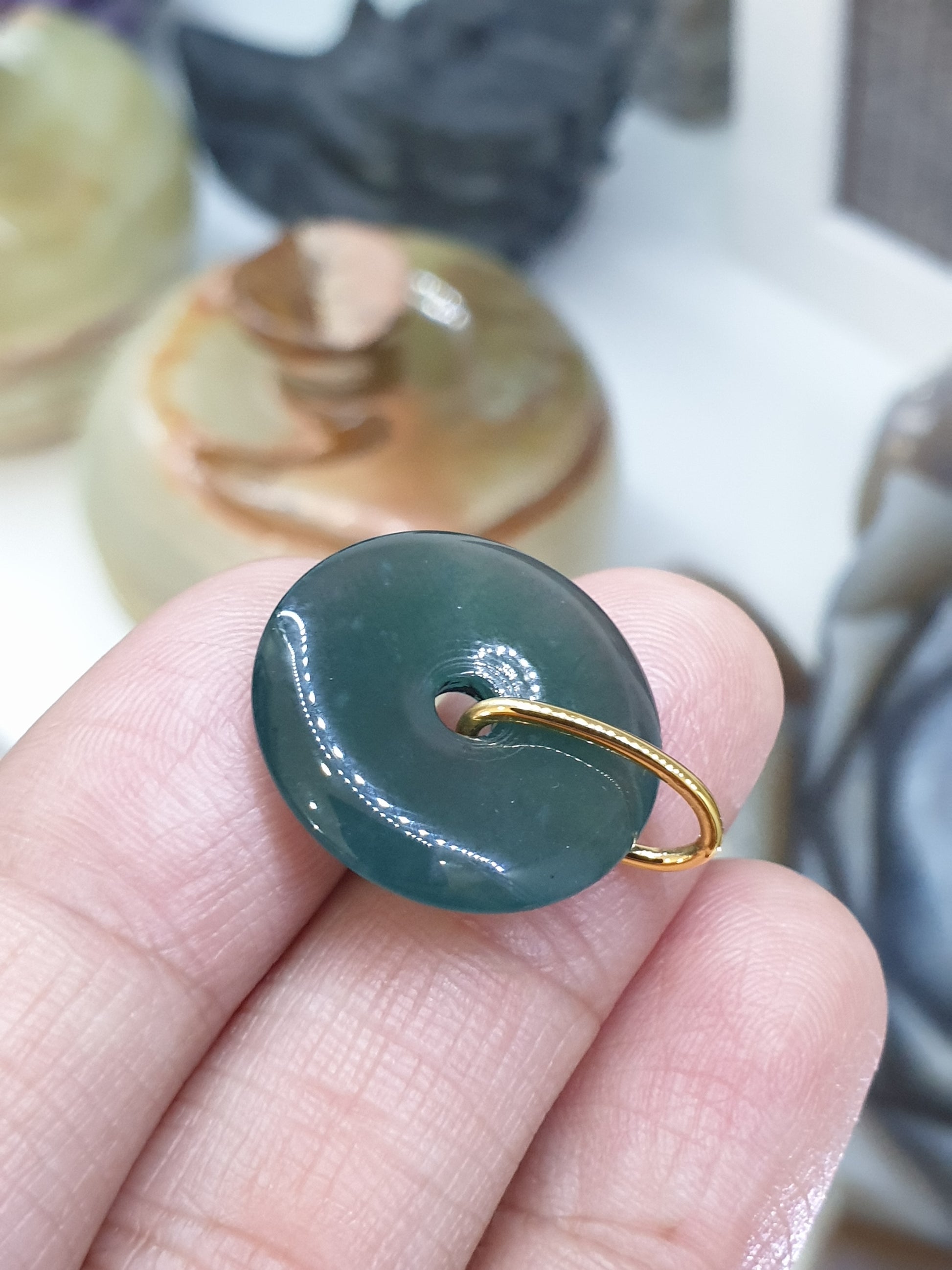 Ping An Kou Jade are believed to bring good health, peace and protection so they are often worn as pieces of jewelry like pendants, rings, earrings, bracelet charms or kept as amulets. Showcasing this lovely stress pendant 😃! A spinning Jade Ping An Kou (Peace Buckle) in solid 18K Gold custom bail. Fei Cui, Type A natural Jadeite (untreated) in glossy, semitranslucent deep ocean blue color. 5 mm bail hole. Whole pendant measures 2.2 cm in width x 2.5 cm in height and weighs aproximately 4.3 grams.