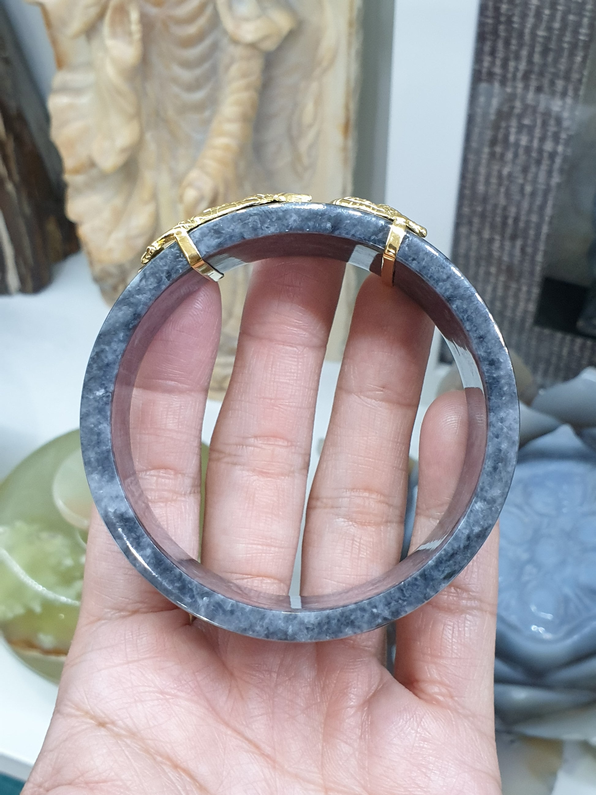 A fierce yet elegant rendition of the Fortune Dragon🐉in micron 3 gold-plated Sterling Silver adorned this rugged-looking, square-cut Black Jade bangle. Gem lab - certified Type A natural Jadeite (Myanmar origin, untreated), high gloss, high polished, speckled black in color. Bangle size 63 (6.3 cm inner diameter, 19.8 cm circumference), 2.5 cm in width, 0.65 cm in thickness and weighs approximately 112 grams total.