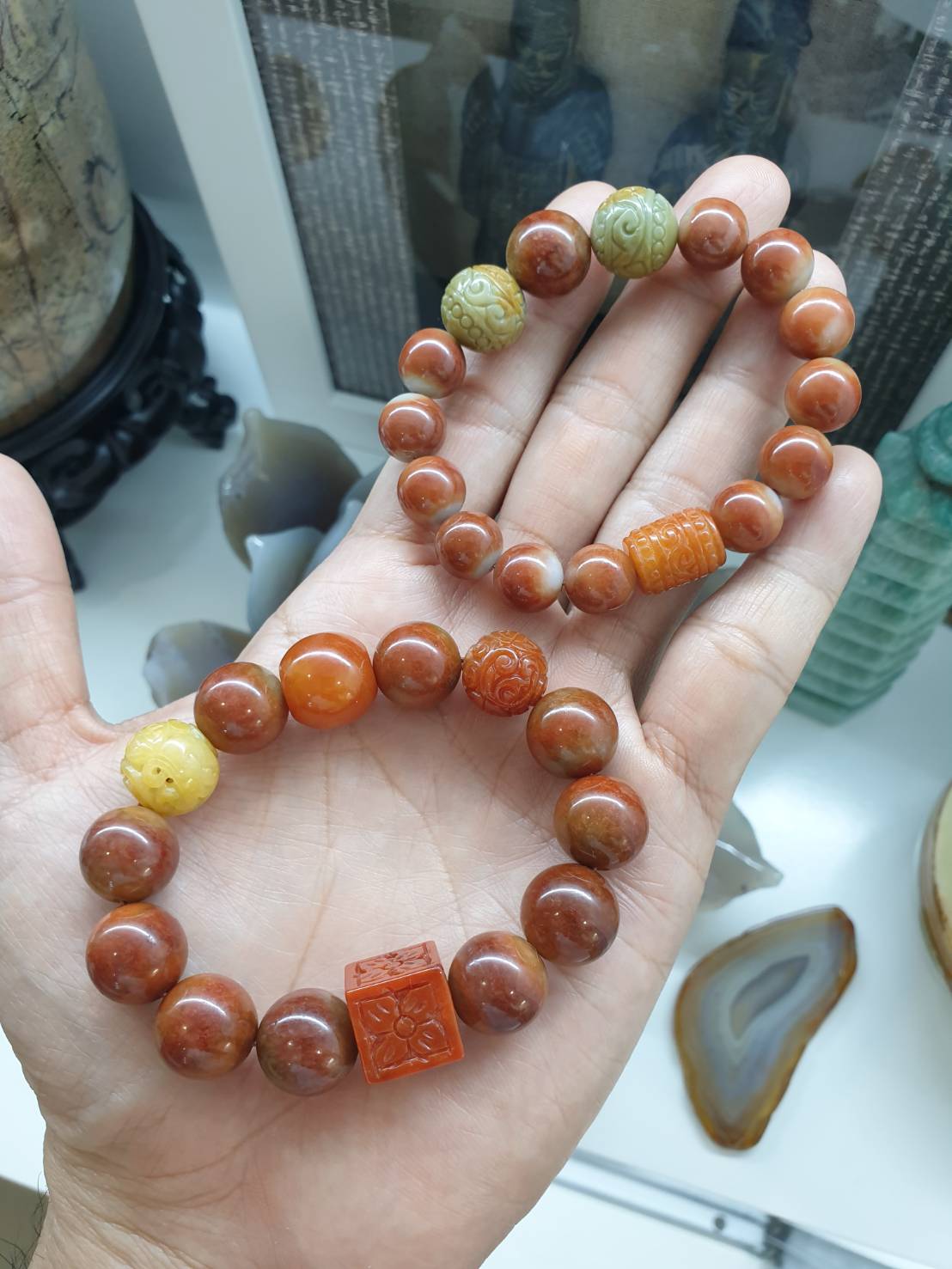 หยกสีแดง สื่อถึง พลังชีวิต ความมั่งคั่ง และการเฉลิมฉลอง ขณะที่ ลูกปัดแกะลายมงคล ช่วยเสริม โชคลาภและการปกป้อง