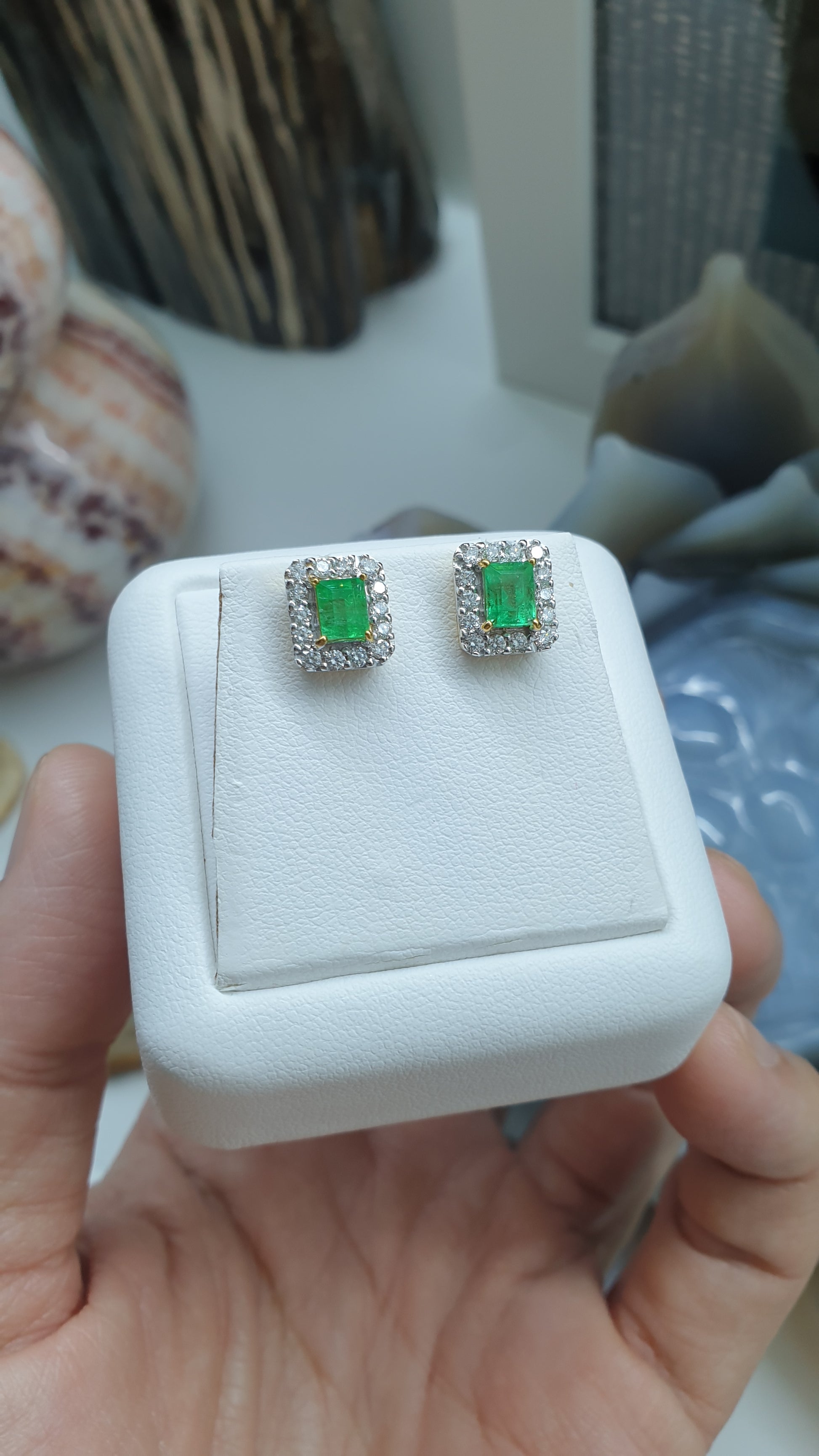 Classic grace meets everyday wearability in these Colombian Emerald & Diamond Stud Earrings. Elegant, symbolic and perfect as a meaningful gift. Handcrafted in 14K yellow Gold (3.6 g total), each pair showcases vivid green Colombian Emeralds (0.4 × 0.5 cm) accented by sparkling white, VVS grade natural Diamonds (0.5 ct total).