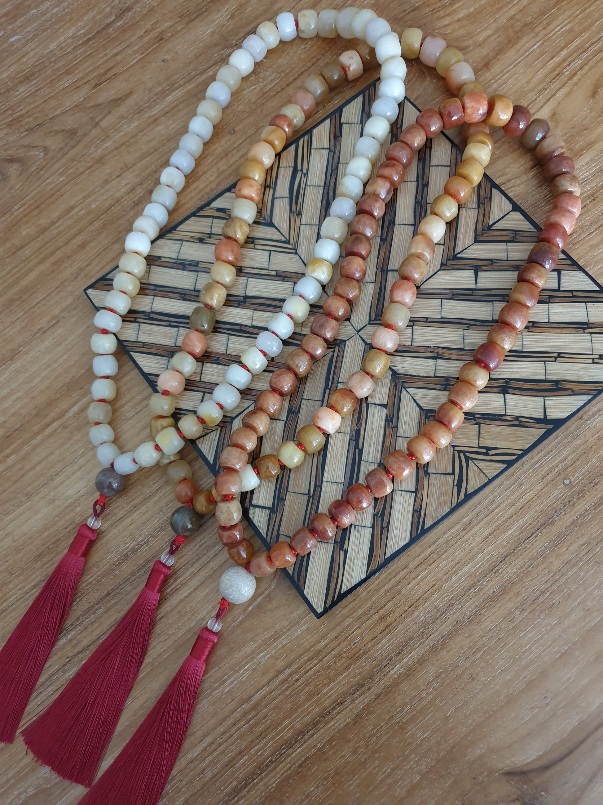 Handcrafted by Pim's Stones Thailand, vintage and handmade Calcite Beads Japa Mala necklace (54 beads version, 34.5 inch total length). Graduating 13 mm to 19 mm size barrel beads strung in 2 strands of red thread with each bead separated by a knot. Petrified Wood Guru bead, 17 mm to 20 mm in size. All components are untreated natural stone beads. Dark red tassle is 5.5 inches long. Whole Mala necklace is 28 inches round plus 6.5 inches pendant (Guru bead & tassle) and weighs approximately 330 grams. Available in 4 bead color variants :