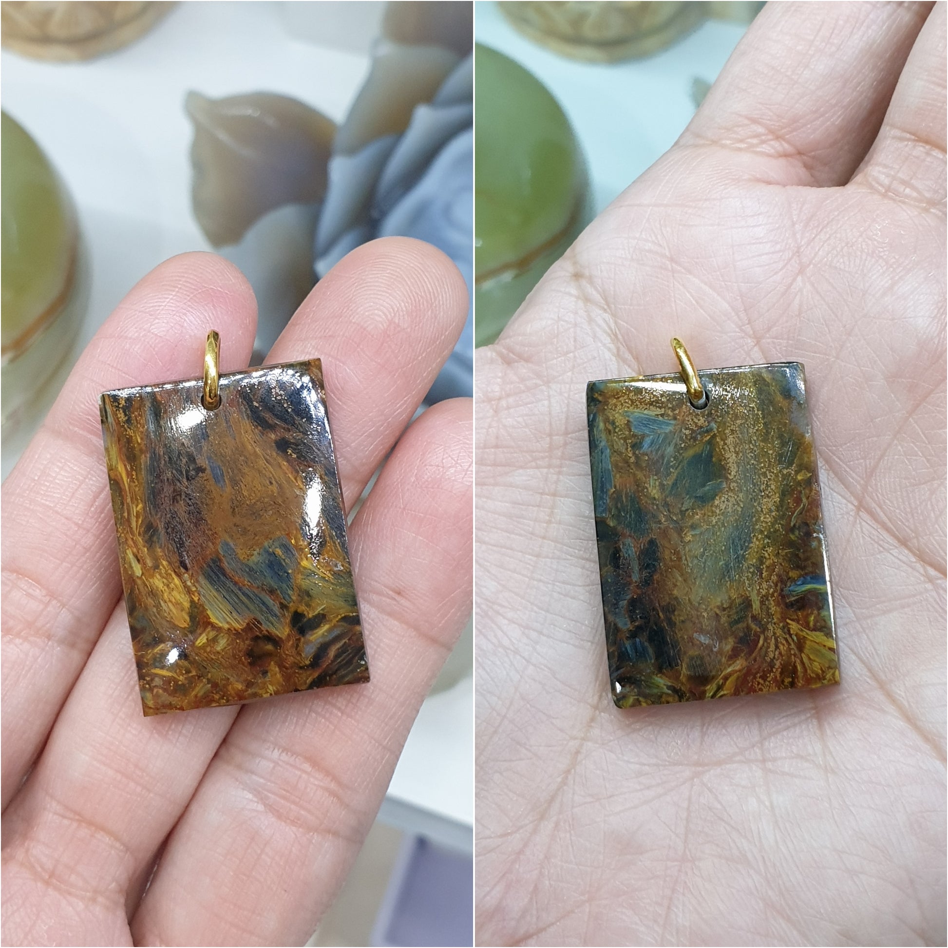 These Pietersite Dog Tag Pendants feature striking natural stone patterns and each piece is set with solid 9K Gold bail.
