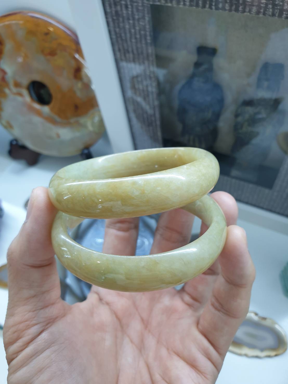 These Golden Honey-Brown Jade Bangles embody warmth, prosperity and refined beauty. Crafted from Type A natural Jadeite (Fei Cui) from Myanmar, each bangle is translucent and beautifully polished, revealing a rich honey-brown glow that captures light from every angle.